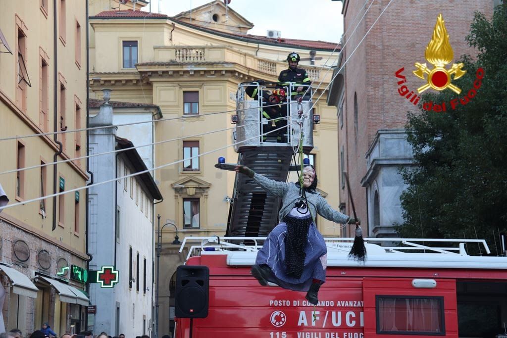 Infine è stato necessario approntare una teleferica dal campanile della chiesa per permettere alla Befana, assistita dal personale SAF (speleo, alpino, fluviale) del Comando di Livorno, di raggiungere la piazza dove ha potuto distribuire dolcetti ai bambini.