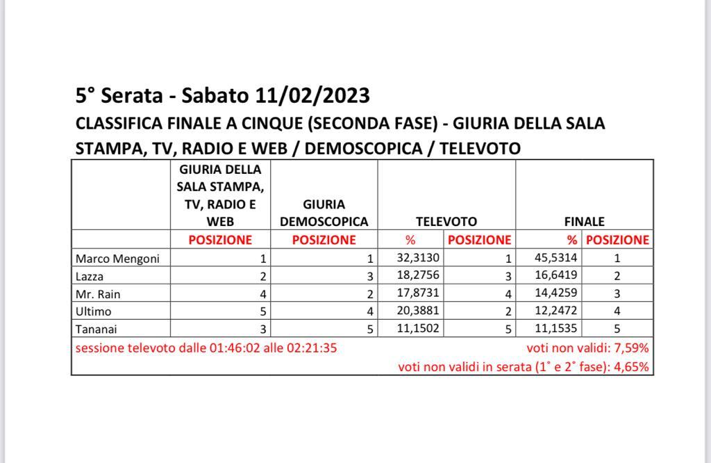 E infine la classifica generale dei 28 cantanti in gara: sul podio Marco Mengoni,