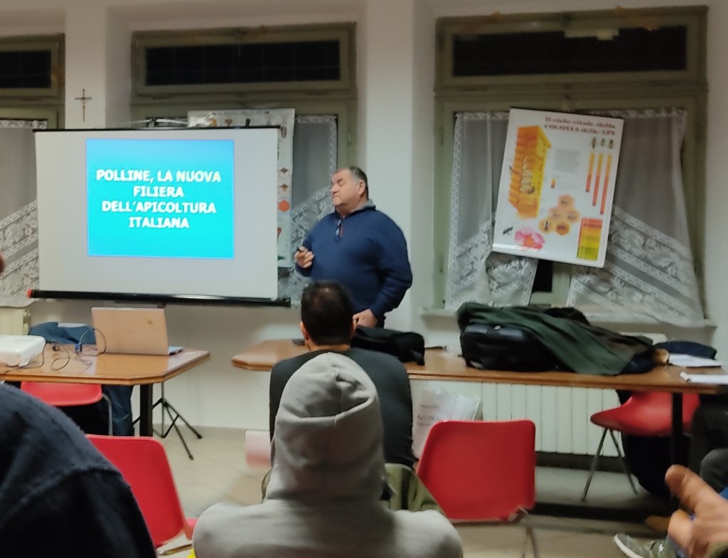 “Questa sera, Aldo ci presenta la relazione che è dedicata sulla nuova Filiera del Polline e del Veleno di Api, due prodotti che hanno una grande potenzialità di applicazione e sviluppo industriale”.