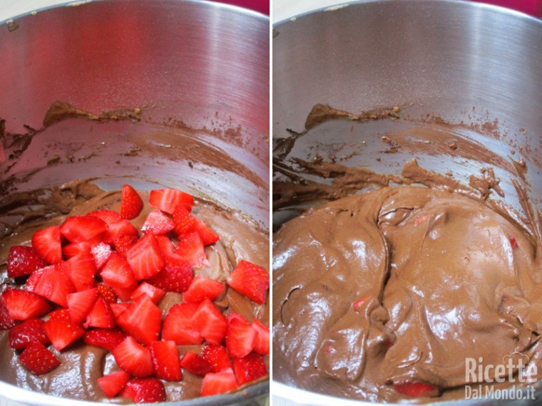 Lavate le fragole, asciugatele e tagliatele a pezzi (tenetene da parte alcune per distribuirle in superficie), quindi unite anche queste all’impasto, incorporandole con una spatola.