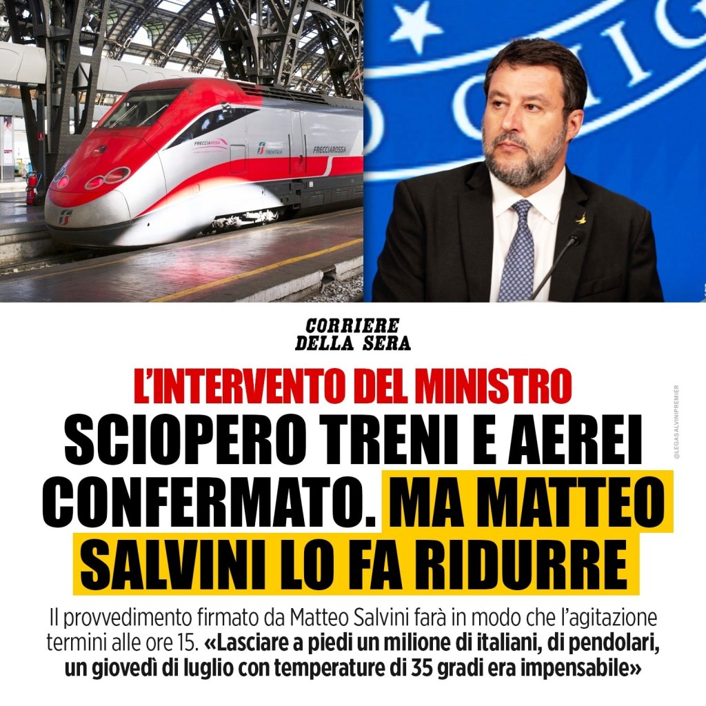 Da Ministro, il mio pieno impegno per garantire un confronto risolutivo tra le aziende e i sindacati in modo da dare risposte a lavoratrici e lavoratori delle ferrovie, rispettando però il diritto alla mobilità di tutti. (Ministro Matteo Salvini)