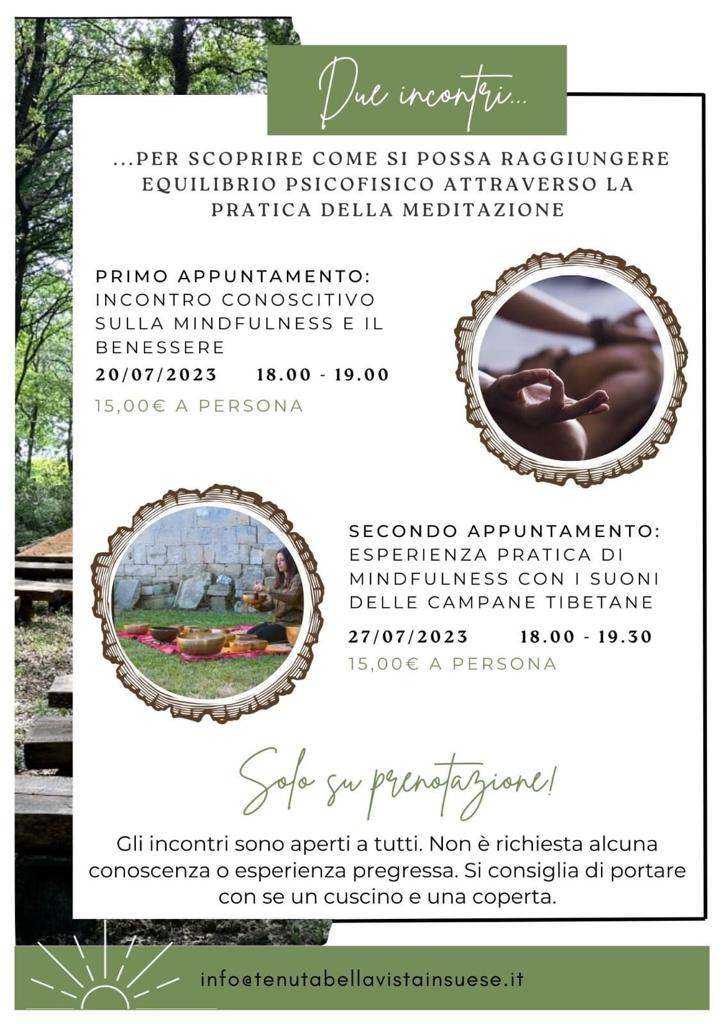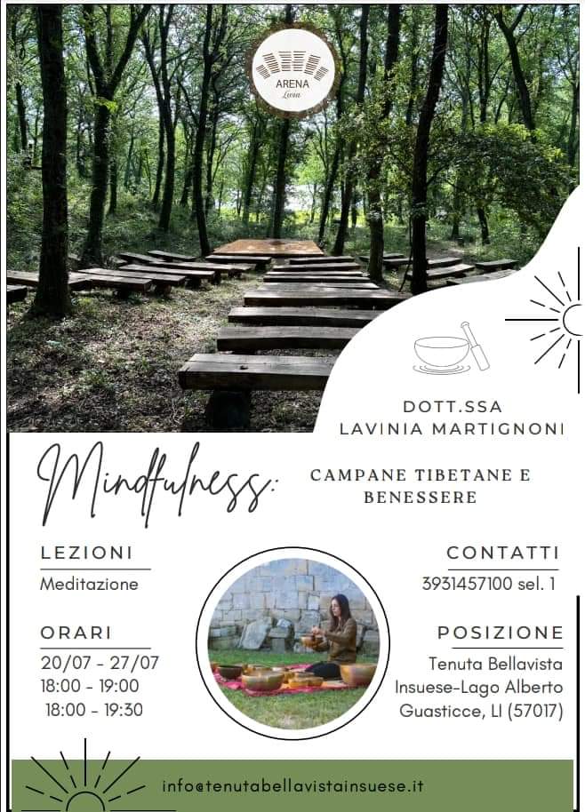 La Tenuta Bellavista Insuese è lieta di invitarvi ai due appuntamenti sulla mindfulness e il benessere, promossi dalla dottoressa Lavinia Martignoni: gli incontri si terranno nel suggestivo anfiteatro naturale dell’Arena Licia