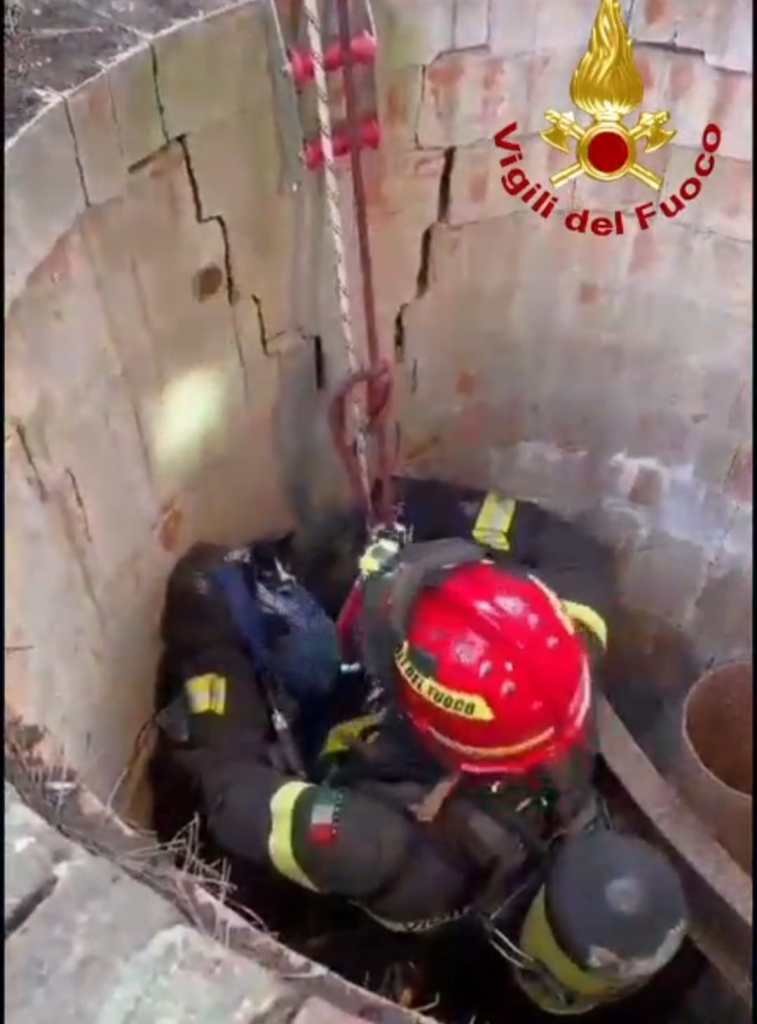 Il personale dei Vigili del Fuoco attraverso tecniche speleo alpino fluviali provvedeva a calarsi nel pozzo, così da recuperare l’animale che riportava la probabile frattura di una zampina.