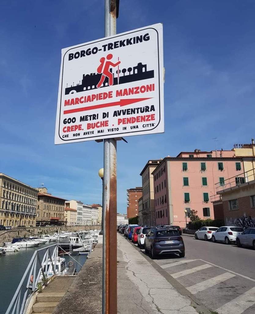 Il cartello campeggiava a inizio Scali Manzoni sul Ponte del Fosso Reale. Recitava: BORGO TREKKING MARCIAPIEDE MANZONI 600 METRI DI AVVENTURA CREPE BUCHE PENDENZE
