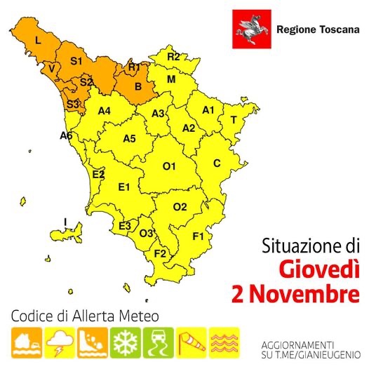 Per la tempesta Ciaran, messa dalla sala regionale per rischio idrogeologico e idraulico dalle 15 di domani giovedì 2 novembre.
