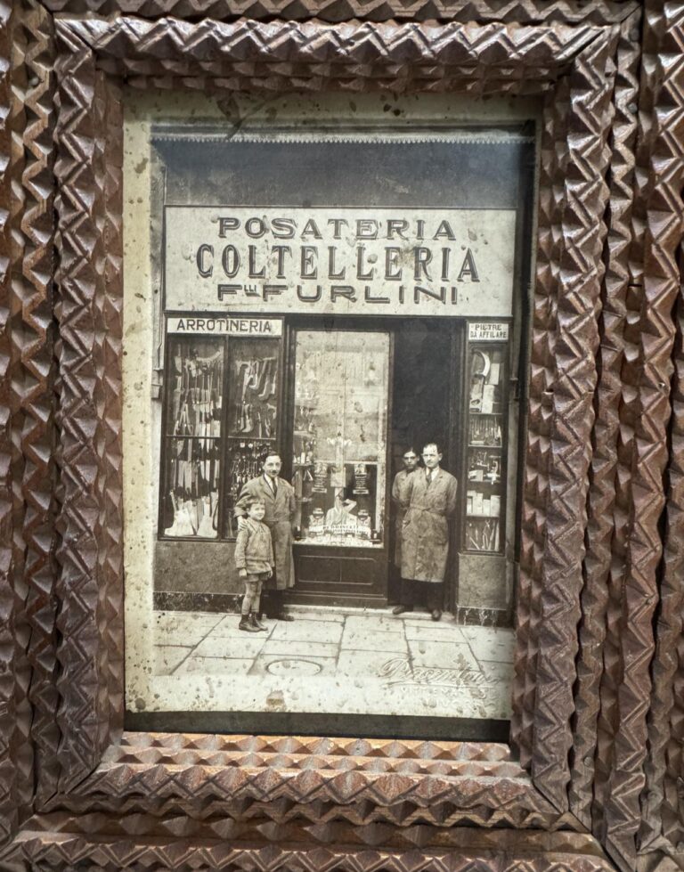 Valter, che ringraziamo per la disponibilità, appoggiato al bancone del negozio Furlini. Nella foto in b/n lo zio e il nonno, arrotini, di Valter venuti dal Trentino davanti al negozio aperto nel 1914
