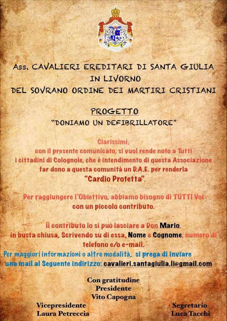L’Associazione Cavalieri Ereditari di Santa Giulia in Livorno ETS, ringrazia Andrea Romiti, Luca Tacchi, tutti Voi sentitamente per la donazione per portare un defibrillatore a Colognole, strumento che, sperando di non dover mai usare, ci fa sentire però più sicuri per la sua presenza e soprattutto sottolinea l’attenzione degli organizzatori e partecipanti al convegno Lega Salvini Premier ed Identità Democrazia “Più Italia meno Europa’, per il benessere della nostra comunità.