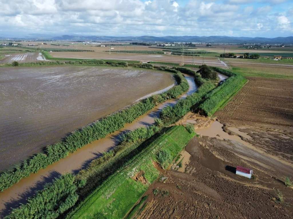 📷Nella foto gentilmente messa a disposizione da Francesco Cirillo si evidenzia in corso del fiume Cornia nei punti in cui ha rotto l’argine in località Affitti