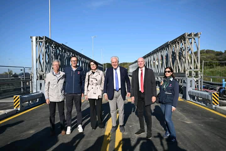 Per quanto concerne il rio Ardenza la sostituzione delle arcate dei Tre Ponti con un grande elemento in metallo senza luci o strutture che fermano l’acqua permetterà alla stessa acqua di confluire nel mare in modo diretto, garantendo maggiore sicurezza. Nella fase transitoria inauguriamo il ponte Bailey, che funge da bypass, che consentirà di lavorare all’abbattimento delle attuali arcate e alla costruzione del nuovo ponte senza creare problemi alla circolazione del traffico, che dunque potrà essere a pieno regime. L’elemento metallico che costituirà strutturalmenteil nuovo ponte è in arrivo, su una mega chiatta, dalla Sicilia. Ai primi del prossimo anno il lavoro complessivo dovrebbe entrare nella fase conclusiva”, ha affermato Giani.