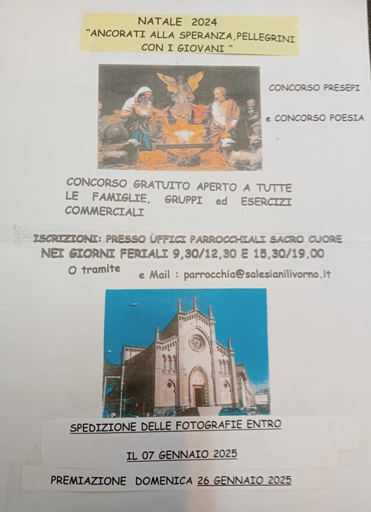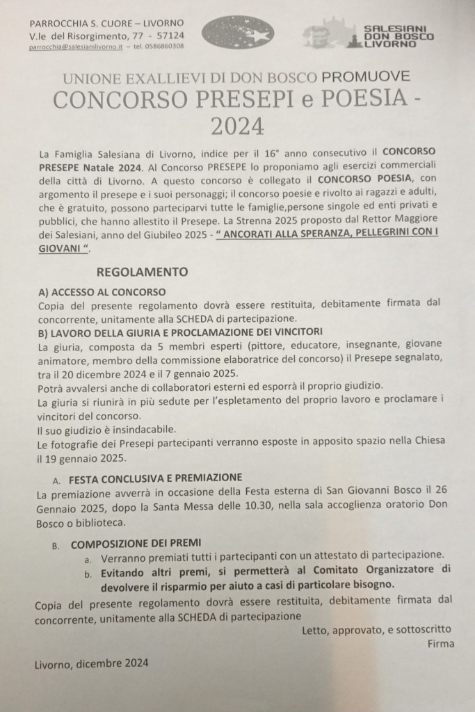 Il concorso Presepe e Poesia 2024 è organizzato da ex Allievi della Parrocchia Sacro Cuore di Gesù (Salesiani) Livorno