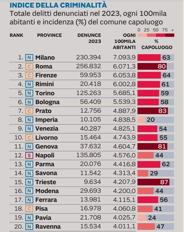 - Indice di criminalità: 6.071,3 denunce ogni 100.000 abitanti.