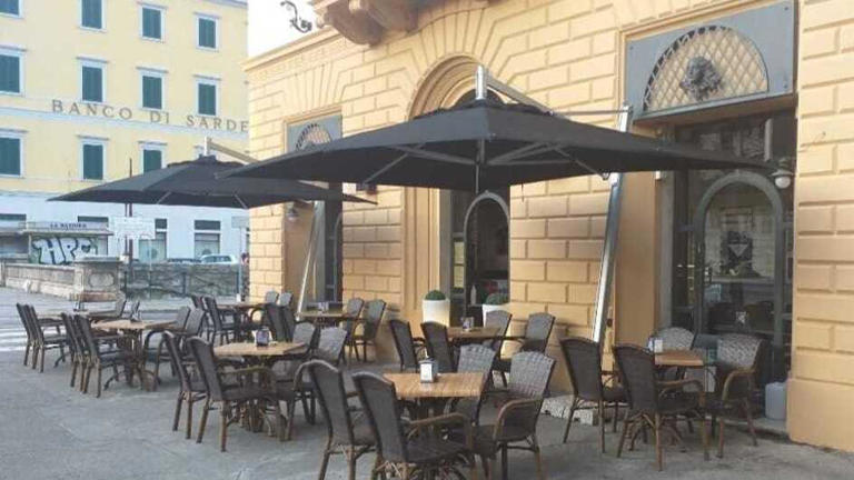I tavoli sotto gli ombrelloni del Folletto in piazza Cavour, gestito da Gianni e Michele Perini