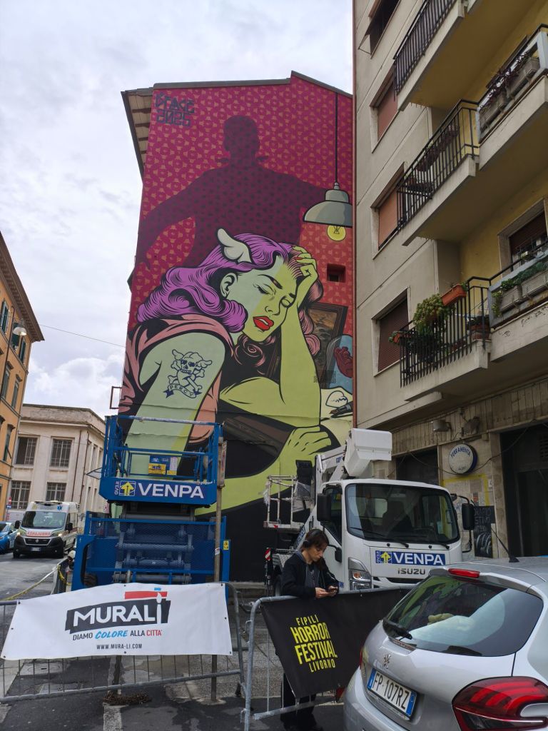 Vernice spray, adesivi, poster e stencil sono gli strumenti del mestiere del writer britannico, che in queste settimane ha lavorato al progetto voluto dalle due associazioni livornesi Murali – Diamo colore alla città e FiPiLi Horror Festival, unite nella rigenerazione degli spazi cittadini e nella promozione dei linguaggi dell’horror d’autore.