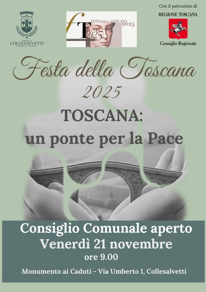 Collesalvetti 19 novembre 2025 – In occasione della ricorrenza del 30 novembre “Festa della Toscana” dedicata, quest’anno, al tema “TOSCANA: un ponte per la pace”, il Consiglio Comunale di Collesalvetti si riunirà in una seduta straordinaria aperta alla cittadinanza che avrà luogo venerdì 21 novembre, ore 9.00, al Monumento ai Caduti di Collesalvetti.“Agli interventi istituzionali – ha spiegato il Presidente del Consiglio comunale Davide Scatena – seguiranno quelli delle Associazioni, dei Dirigenti Scolastici, degli alunni e delle alunne delle scuole del territorio che porteranno il loro contributo con disegni, poesie e interventi musicali sul tema della Pace”.